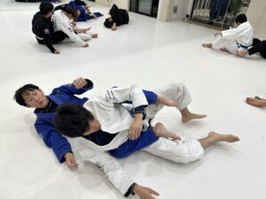 相手の背後に着き、両足を絡め、相手の動きに合わせてポジションをキープしつつ、絞め技、関節技を狙っていきます。